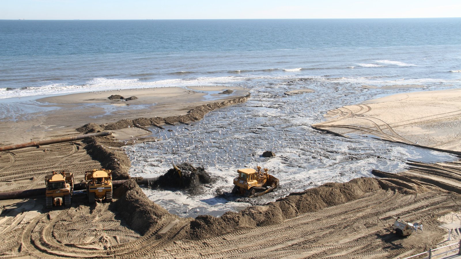 Sand is pumped through pipelines onto the beach.